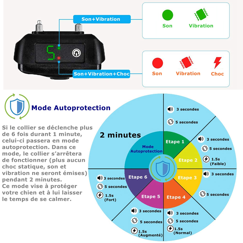 - AUTOMATIC PROTECTION MODE: If the collar is triggered more than 2 times in 1 minute, it will enter self-protection mode. In this mode, the collar will stop working (no more static shock, sound and vibration will be emitted) for 2 minutes. This mode is intended to protect your dog and give him time to calm down.