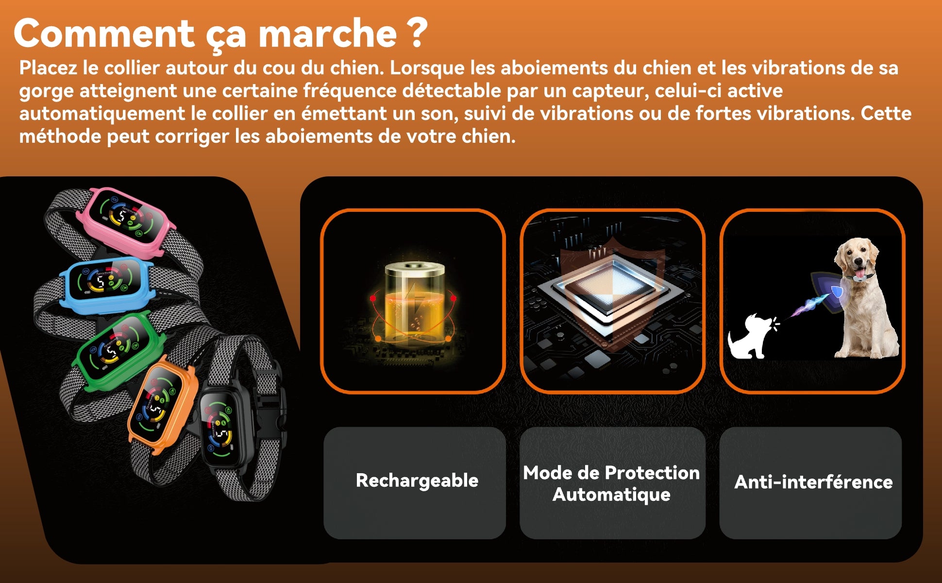 Place the collar around the dog's neck. When the dog's barking and throat vibrations reach a certain frequency that can be detected by a sensor, the sensor automatically activates the collar by emitting a sound, followed by vibrations or strong vibrations. This method can correct your dog's barking.